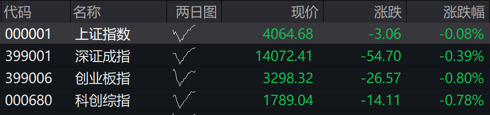 沪指低开0.08%,深成指低开0.39% ,创业板指低开0.80%。科创综指低开0.78%。
